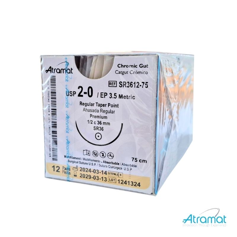CATGUT CROMICO USP 2-0, 75 CM AGUJA SR- 36 AHUSADA REGULAR PREMIUM 36 MM 1/2CIRCULO
