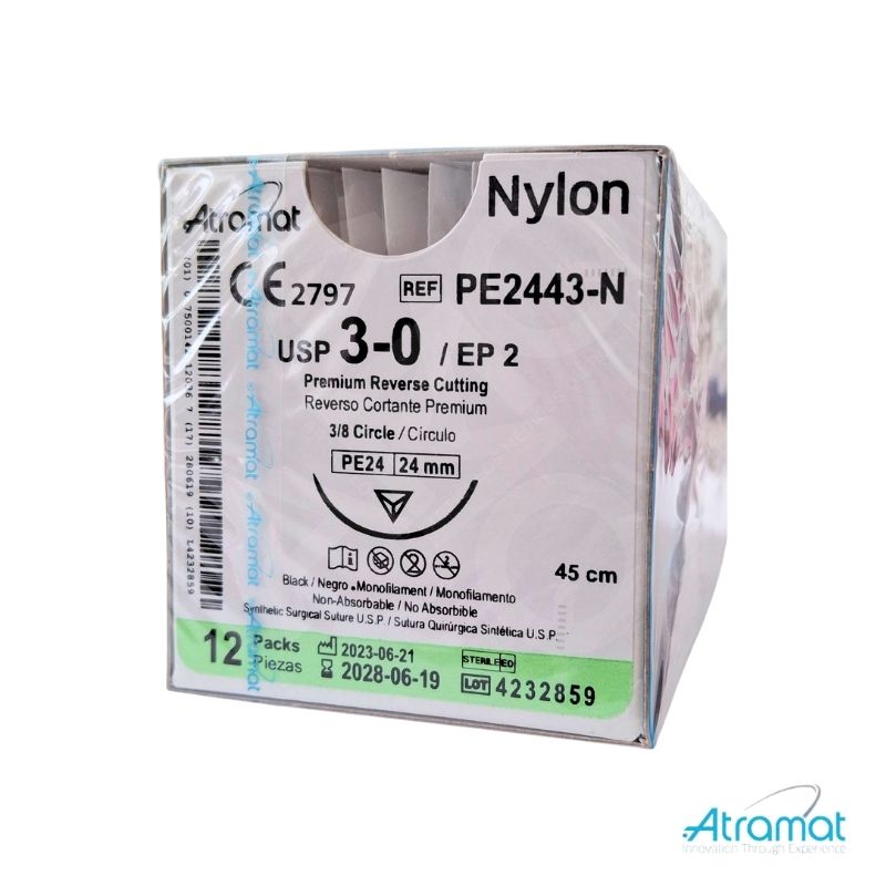 NYLON NEGRO USP 3-0, 45 CM AGUJA PE-24REVERSO CORTANTE PREMIUM 24 MM 3/8 CIRCULO